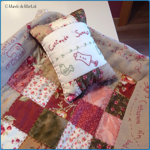 En este caso fue Concha la más afortunada pues me dio tiempo a acabarle dos cosas, un pongo todo para la mesa de costura y una bolsa de lino con su inicial bordada, este bordado con muñeca incluida pertenece al libro de Vanessa Ouache, donde hay preciosos proyectos para llevar a cabo. A Elena y Mari Carmen sólo les pude llevar una